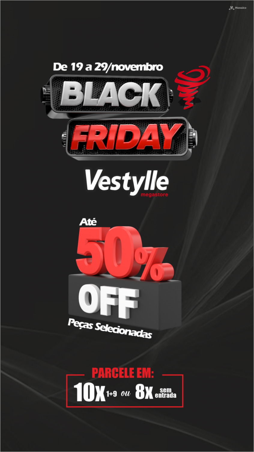 A Black Friday da Vestylle Megastore Araraquara já começou! De 19 a 29 de novembro, peças selecionadas com até 50% de desconto. Não perca!